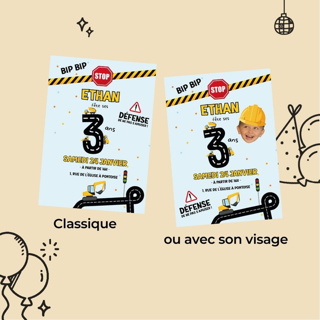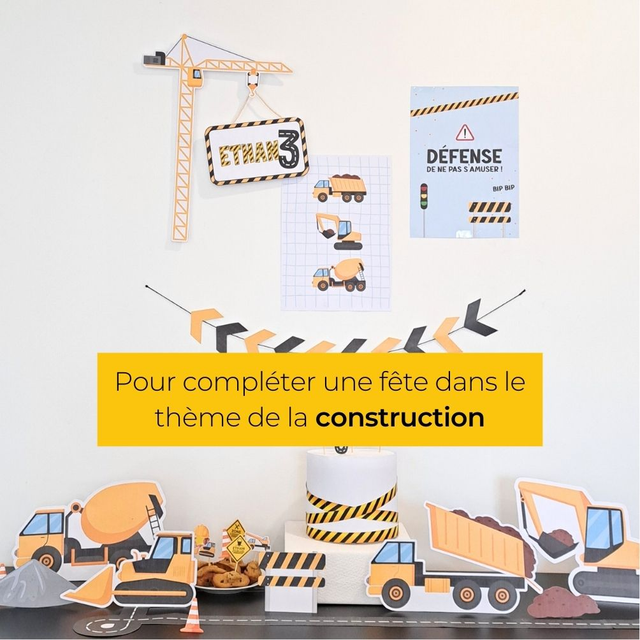 Parfaite pour les petits fans de camions, pelleteuses, grues et casques de chantier, elle annonce une fête fun et dynamique dès le premier clic.
