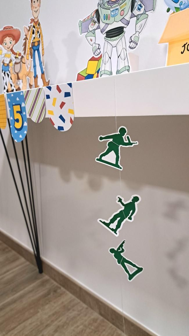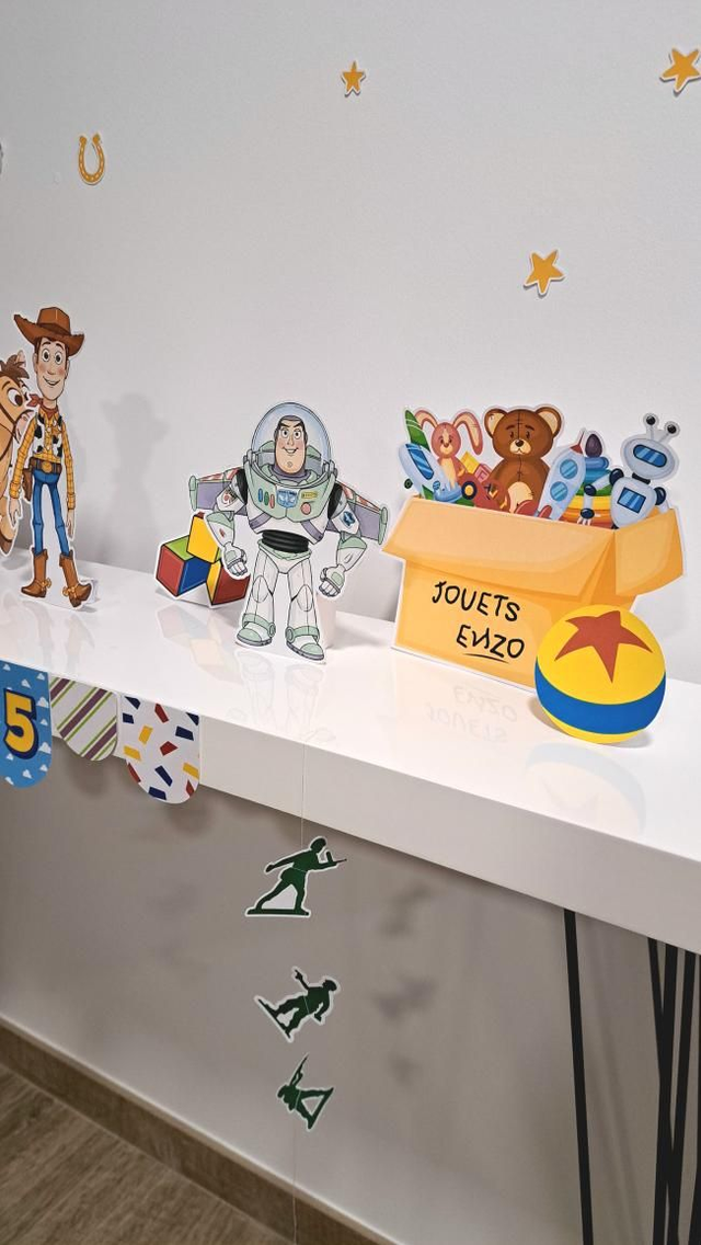 - Décors de table (Woody, Buzz, Jessie et Pile-Poil, 3 soldats vert, cubes, carton de jouets et ballon)